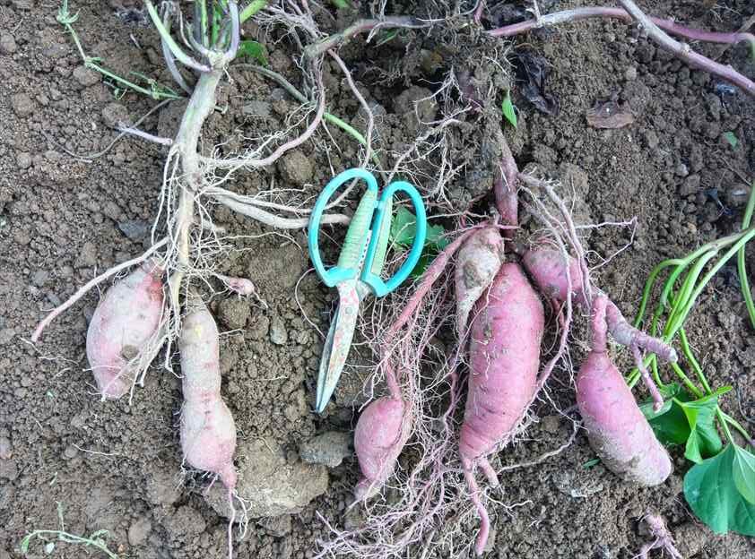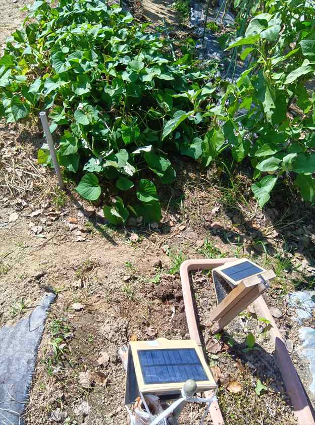 ↓余ったツルを指していたら育ったサツマイモと動物対策のセンサーライト2つ(1つはセンサーが故障して夜の点灯のみ)