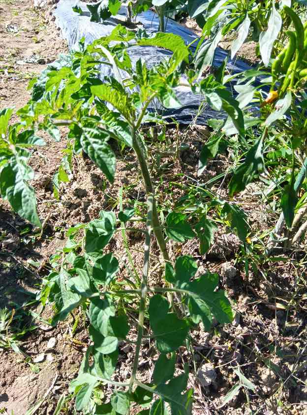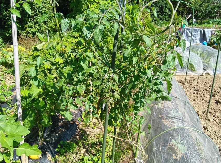 ↓元気のいいトマトを1本だけ残していたら実をつけました、虫は減ったものの赤くなるかどうか⁈