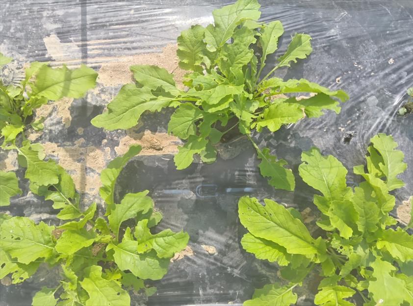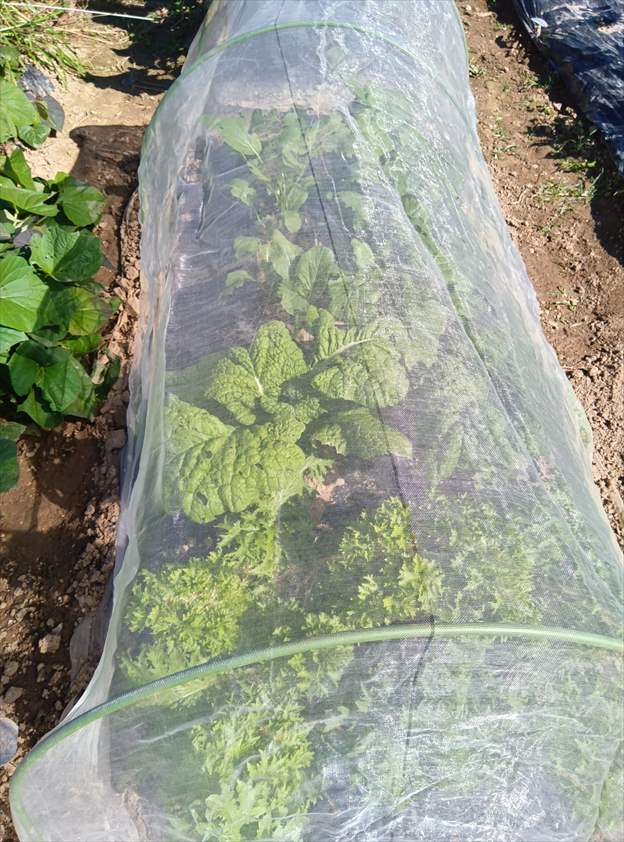 ↓ネットの中のダイコン、フダンソウ、コマツナ