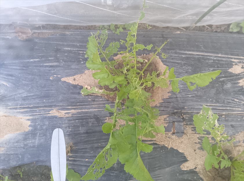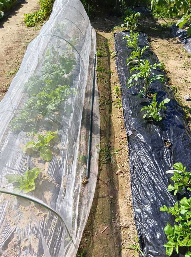 ダイコン 順調に育っているものと、虫被害にあっているもの(ネット張りました)