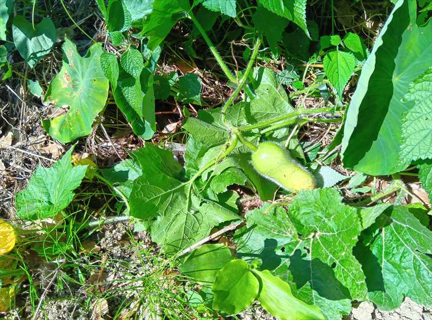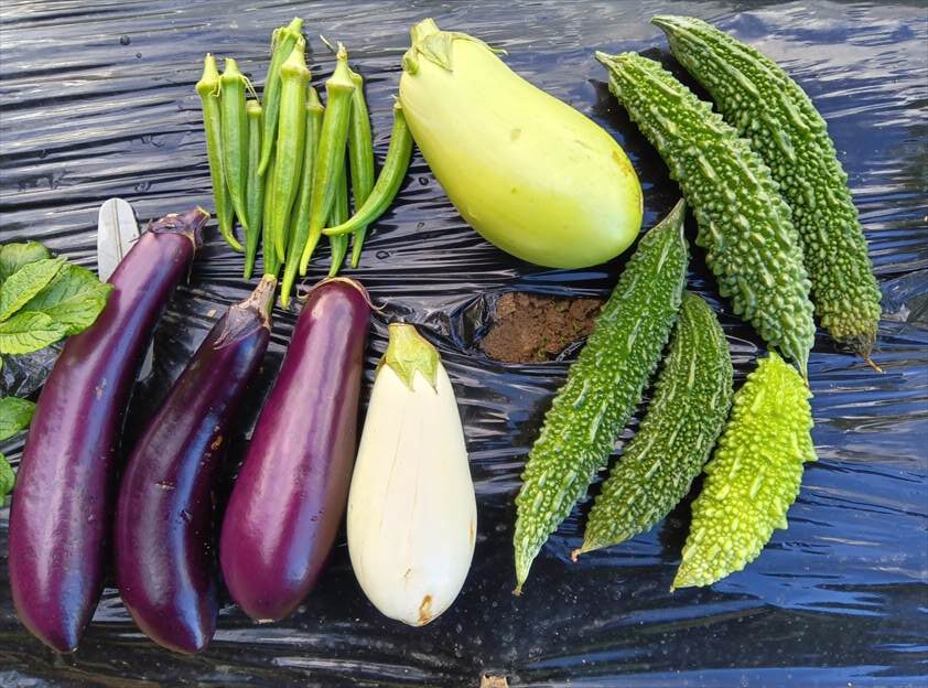 収穫できるのは、ナス、ゴーヤ、オクラ、ネギ、トウガラシ、サツマイモ?