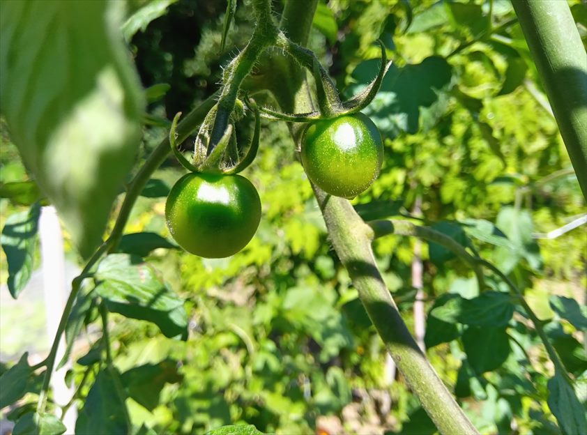 ↓元気のいいトマトを1本だけ残していたら実をつけました、虫は減ったものの赤くなるかどうか⁈