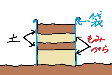 袋は90Lのゴミ袋。破けそうだったので2枚重ねました。底を切って筒状にします。それから、もみがら、土の順に重ねていきます。何かぶつかったらすぐに破けそうだったので余っていた防草シートで囲んで終了!これも結構時間がかかり、楽な方法かどうか…