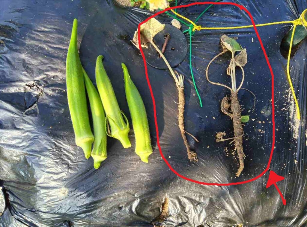 右側の赤マルで囲んだところご覧ください。何やら根っこらしきものがありますが、これが収穫したゴボウです。ミニゴボウとは種の袋に書いてありましたが、あまりにもミニ過ぎますよね。通常なら30cmくらいに成長する予定でしたが、オクラと比べたらわかるように長さは10cm程度、太さは鉛筆ほどもないです。ざんねーん‼