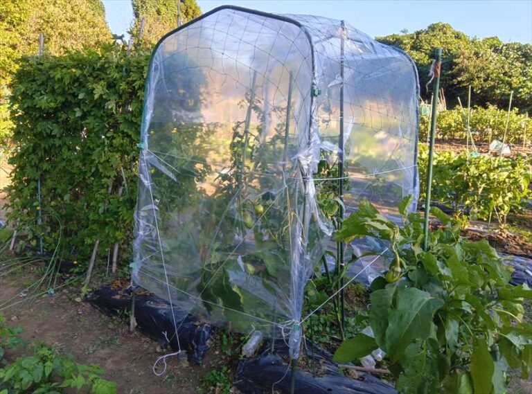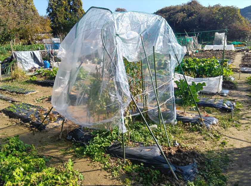 10月末、残しておいたトマトがまだ実をつけていたので、試しにビニールで囲ってみました。隙間も多いのでどの程度効果があるかはわかりませんが…