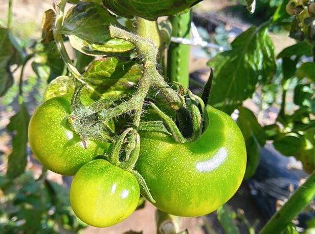 (ハウスの中のほうのトマトはまだ青々した感じでした:写真真ん中の下と写真右)