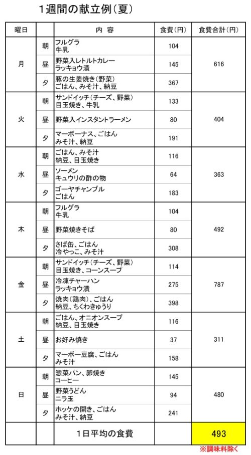 何と、1日の食費は500円未満!(30日とすると、500円×30日=15,000円)