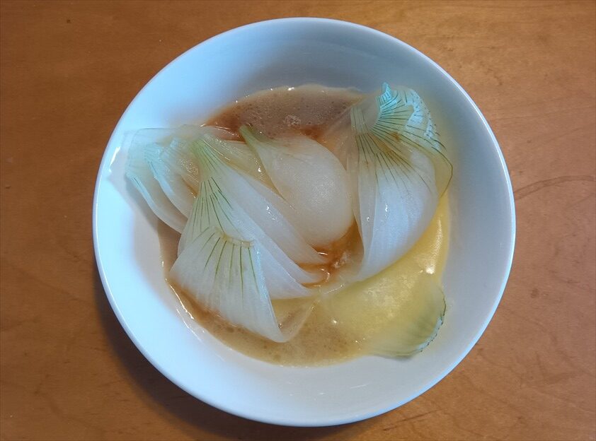 タマネギ上部に切れ目を入れて、レンジでチンするだけ。そのままでも甘くておいしいですが、バターを乗せてさらにチン、ポン酢でもいけます。